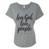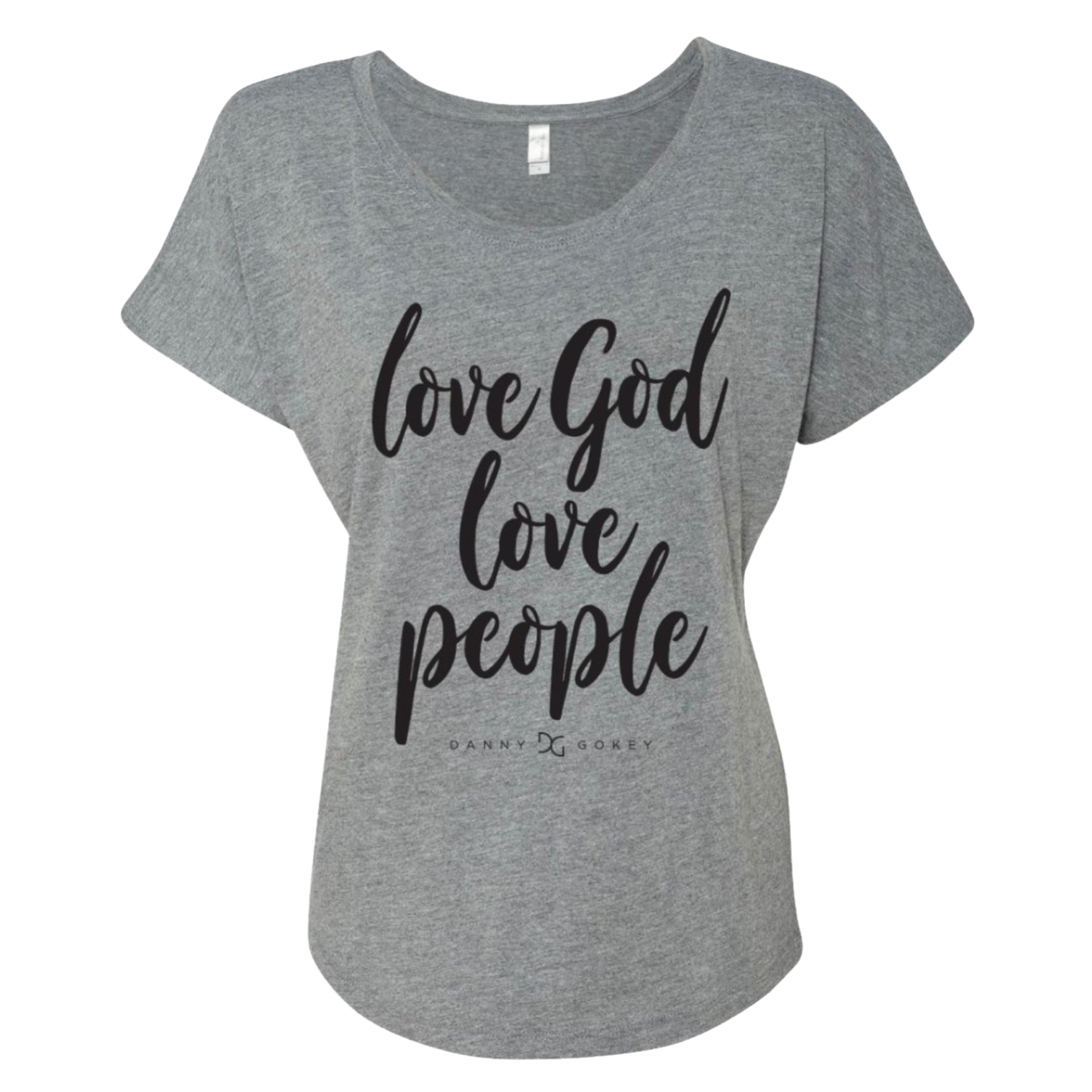 Grey, ladies fit t-shirt with Love God Love People on the front.